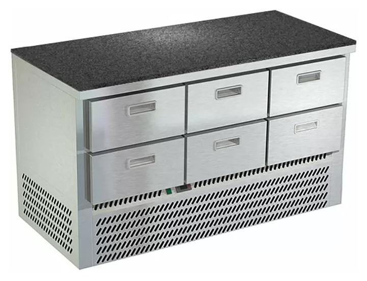 Морозильный стол Техно-ТТ СПН/М-323/06-1406 предназначен для раскатки теста, обработки, заморозки и долговременного хранения продуктов, полуфабрикатов, напитков и мороженого на предприятиях общественного питания и торговли. Модель оснащена компрессором, произведенным в Испании, 6 гастронормированными ящиками, направляющими с доводчиками (Австрия) и регулируемыми опорными ножками. Корпус выполнен из нержавеющей стали AISI 430, задняя стенка и дно - из оцинкованной стали, столешница - каменная.