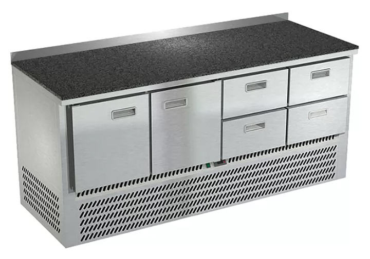 Морозильный стол Техно-ТТ СПН/М-422/24-1906 предназначен для раскатки теста, обработки, заморозки и долговременного хранения продуктов, полуфабрикатов, напитков и мороженого на предприятиях общественного питания и торговли. Модель оснащена компрессором, произведенным в Испании, 2 дверями с доводчиками (Польша), 2 регулируемыми по высоте полками-решетками, 4 гастронормированными ящиками, направляющими с доводчиками (Австрия) и регулируемыми опорными ножками. Корпус выполнен из нержавеющей стали AISI 430, задняя стенка и дно - из оцинкованной стали, столешница - каменная.
