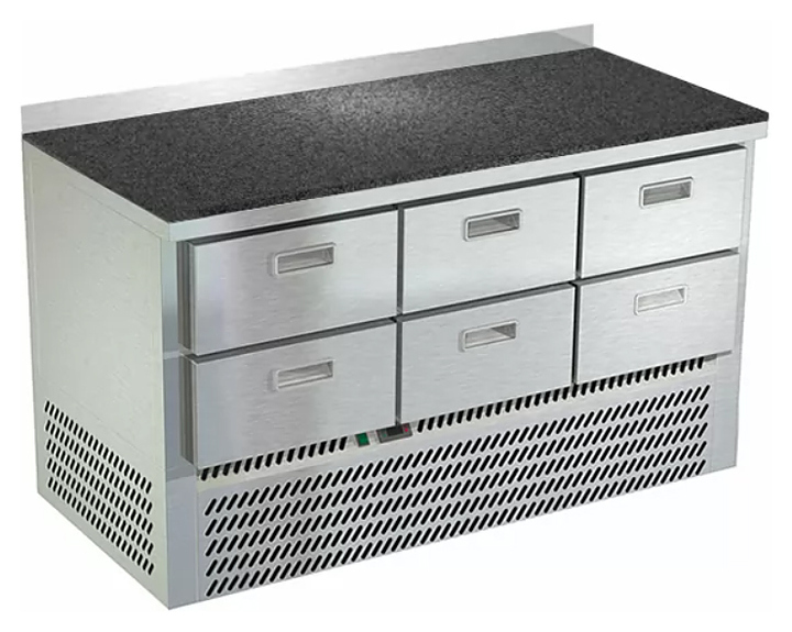 Морозильный стол Техно-ТТ СПН/М-423/06-1406 предназначен для раскатки теста, обработки, заморозки и долговременного хранения продуктов, полуфабрикатов, напитков и мороженого на предприятиях общественного питания и торговли. Модель оснащена компрессором, произведенным в Испании, 6 гастронормированными ящиками, направляющими с доводчиками (Австрия) и регулируемыми опорными ножками. Корпус выполнен из нержавеющей стали AISI 430, задняя стенка и дно - из оцинкованной стали, столешница - каменная.