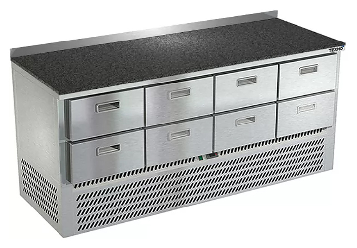 Морозильный стол Техно-ТТ СПН/М-423/08-1906 предназначен для раскатки теста, обработки, заморозки и долговременного хранения продуктов, полуфабрикатов, напитков и мороженого на предприятиях общественного питания и торговли. Модель оснащена компрессором, произведенным в Испании, 8 гастронормированными ящиками, направляющими с доводчиками (Австрия) и регулируемыми опорными ножками. Корпус выполнен из нержавеющей стали AISI 430, задняя стенка и дно - из оцинкованной стали, столешница - каменная.