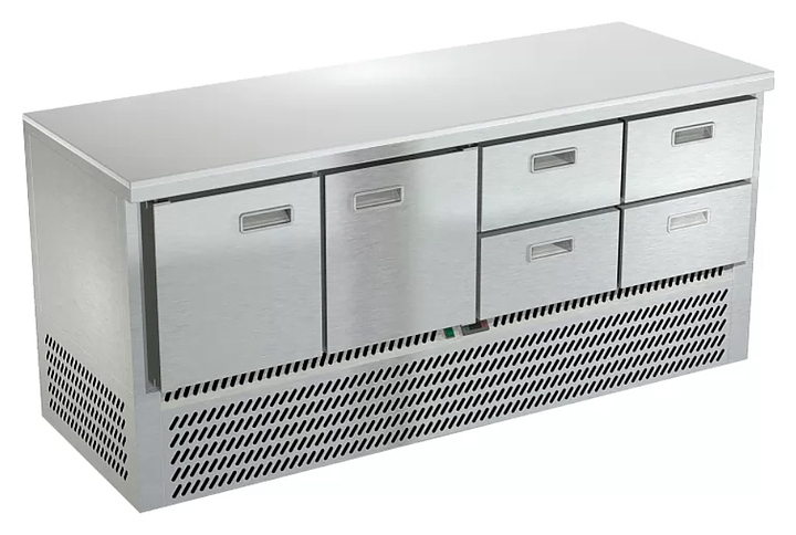 Морозильный стол Техно-ТТ СПН/М-522/24-1907 предназначен для раскатки теста, обработки, заморозки и долговременного хранения продуктов, полуфабрикатов, напитков и мороженого на предприятиях общественного питания и торговли. Модель оснащена компрессором, произведенным в Испании, 2 дверями с доводчиками (Польша), 2 регулируемыми по высоте полками-решетками, 4 гастронормированными ящиками, направляющими с доводчиками (Австрия) и регулируемыми опорными ножками. Корпус выполнен из нержавеющей стали AISI 430, задняя стенка и дно - из оцинкованной стали, столешница - из полипропилена.