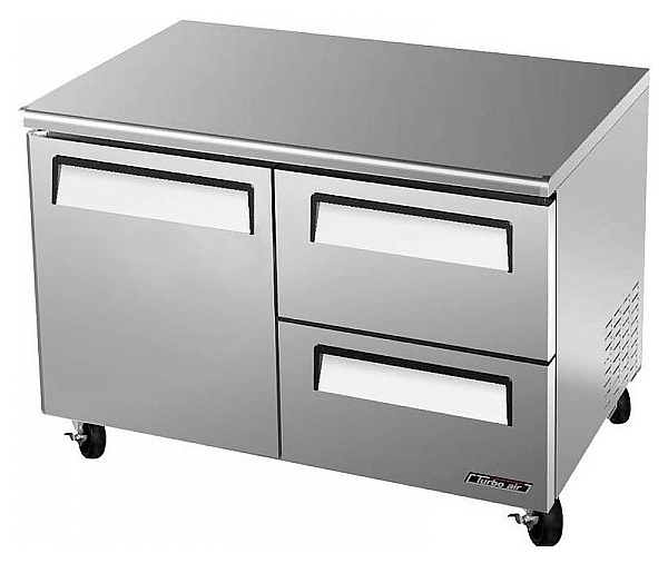 Морозильный стол Turbo air CMUF-48-2D-2 предназначен для обработки, охлаждения, заморозки и длительного хранения пищевых продуктов на предприятиях общественного питания и торговли. Модель оснащена дверцей, регулируемой полкой, 2 ящиками, эргономичными ручками и 4 колесами. Корпус выполнен из нержавеющей стали (гальванизированная сталь на оборотной стороне и внизу), уплотнения - из ABS-пластика, пол - из нержавеющей стали с алюминиевыми вставками по бокам и сзади, полка - из толстой стальной проволоки с виниловым покрытием, тройные направляющие ящиков - из нержавеющей стали.