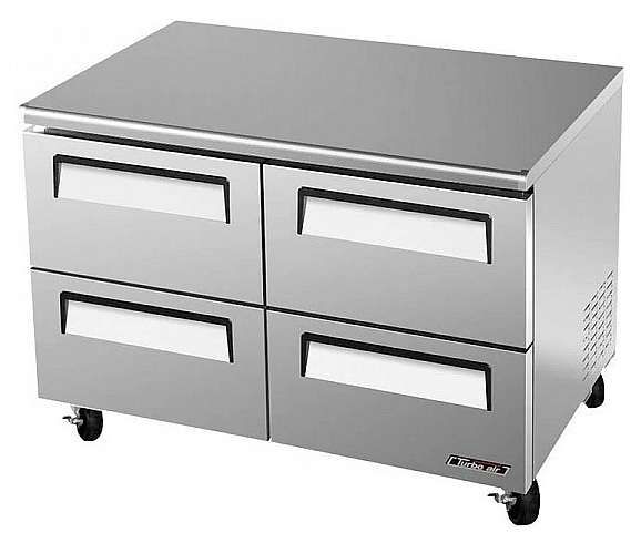 Морозильный стол Turbo air CMUF-48-2D-4 предназначен для обработки, охлаждения, заморозки и длительного хранения пищевых продуктов на предприятиях общественного питания и торговли. Модель оснащена 4 ящиками, эргономичными ручками и 4 колесами. Корпус выполнен из нержавеющей стали (гальванизированная сталь на оборотной стороне и внизу), уплотнения - из ABS-пластика, пол - из нержавеющей стали с алюминиевыми вставками по бокам и сзади, тройные направляющие ящиков - из нержавеющей стали.