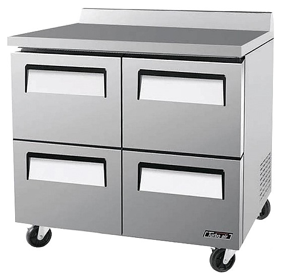 Морозильный стол Turbo air CMWF-36-2D-4 предназначен для обработки, охлаждения, заморозки и длительного хранения пищевых продуктов на предприятиях общественного питания и торговли. Модель оснащена 4 ящиками с эргономичными ручками и 4 колесами. Корпус выполнен из нержавеющей стали (гальванизированная сталь на оборотной стороне и внизу), пол - из нержавеющей стали с алюминиевыми вставками по бокам и сзади, тройные направляющие ящиков - из нержавеющей стали.