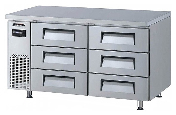 Морозильный стол Turbo air KUF15-3D-6-750 предназначен для обработки, охлаждения, заморозки и длительного хранения пищевых продуктов на предприятиях общественного питания и торговли. Модель оснащена 6 ящиками с эргономичными ручками и 4 регулируемыми ножками. Корпус выполнен из нержавеющей стали (гальванизированная сталь на оборотной стороне и внизу), пол - из нержавеющей стали с алюминиевыми вставками по бокам и сзади, тройные направляющие ящиков и ножки - из нержавеющей стали, уплотнение - из ABS-пластика.