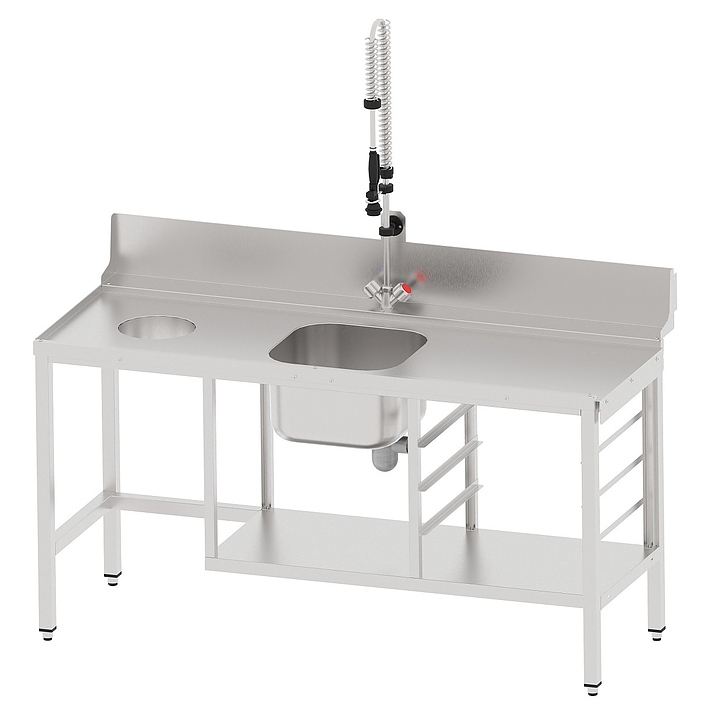 Предмоечный стол Abat СПМП-7-7 используется совместно с купольными и туннельными посудомоечными машинами МПК, МПТ на предприятиях общественного питания и торговли. Модель оснащена моечной ванной, отверстием для сбора крупных отходов и регулируемыми по высоте ножками.
