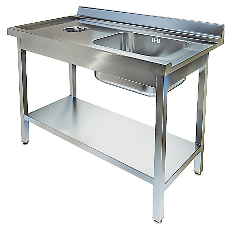 Приставной к посудомоечной машине стол Техно-ТТ СПО-523/1207Л/ЛевКр используется на предприятиях общественного питания и торговли для мытья и ополаскивания посуды и различного инвентаря. Модель оснащена отверстием для сбора отходов, расположенным слева, моечной ванной справа, сплошной полкой и регулируемыми по высоте ножками, что позволяет компенсировать неровности пола. Разборный каркас выполнен из трубы 40х40 нержавеющей стали AISI 304, цельнотянутая мойка, полка и столешница - из нержавеющей стали AISI 304.