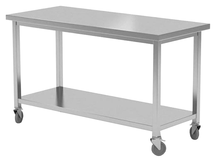 Стол-тележка Restoinox СТПК-15/9-П используется в прачечных для размещения белья. Модель оснащена 4 колесами, 2 из которых снабжены стопором. Ножки выполнены из квадратной трубы 40х40 мм нержавеющей стали Aisi 430, корпус, рабочая поверхность и полка - из нержавеющей стали Aisi 430, задняя стенка - из оцинкованной стали, столешница усилена листом ЛДСП.
