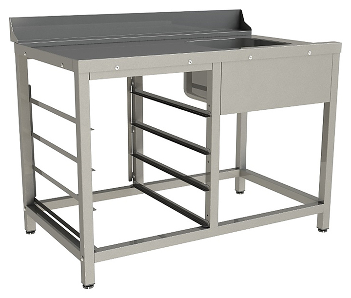 Входной стол Restoinox СВПМВЦН/1-12/7,4-Б предназначен для совместного использования с посудомоечной машиной для размещения и мойки грязной посуды на предприятиях общественного питания. Модель оснащена направляющими для кассет, цельнотянутой ванной, отверстием под смеситель и регулируемыми по высоте пластиковыми опорами. Каркас выполнен из трубы 40х40 мм нержавеющей стали AISI 430, столешница - из нержавеющей стали AISI 430, ванна - из нержавеющей стали AISI 304. Столешница усилена листом ЛДСП.