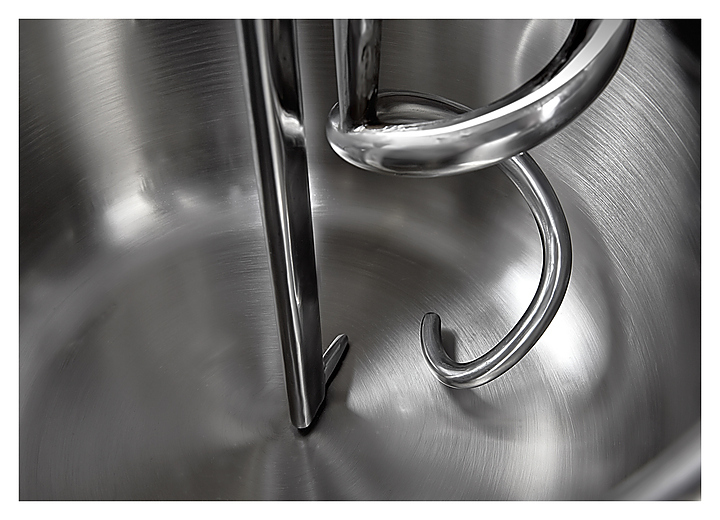 - Отсекатель и прилегание крюка с минимальным зазором ко дну дежи обеспечивают качественный промес теста