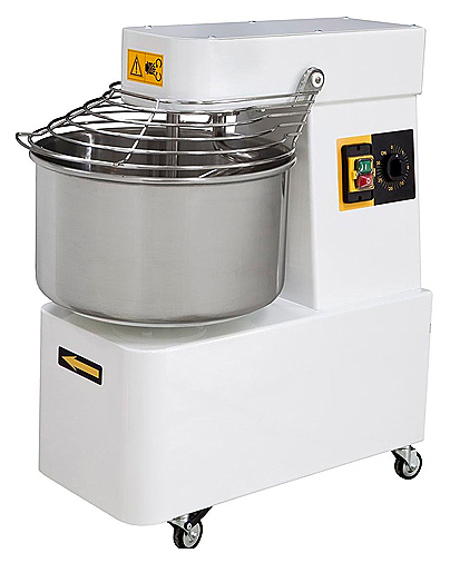 Тестомес спиральный имеет в своей конструкции дежу, спиралевидный месильный орган, тесторазделительный стержень, крышку, колеса, приводной механизм и крюк из нержавеющей стали. Оборудование настольное оснащено таймером.