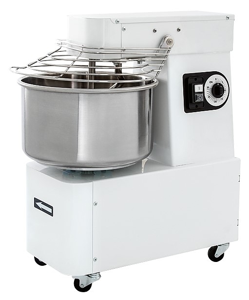 Тестомес спиральный имеет в своей конструкции дежу, спиралевидный месильный орган, тесторазделительный стержень, крышку, колеса, приводной механизм и крюк из нержавеющей стали. Оборудование настольное оснащено таймером.