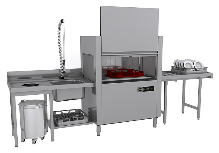 В комплект поставки входят дозаторы и подключение к холодной воде. Модуль сушки, столы для грязной и чистой посуды, накопитель пара и вентилятор вытяжки заказываются отдельно.