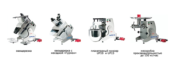 Для кухонь производительностью 60-200 порций идеально подойдет универсальная кухонная машина Supra 6E с разнообразными насадками: