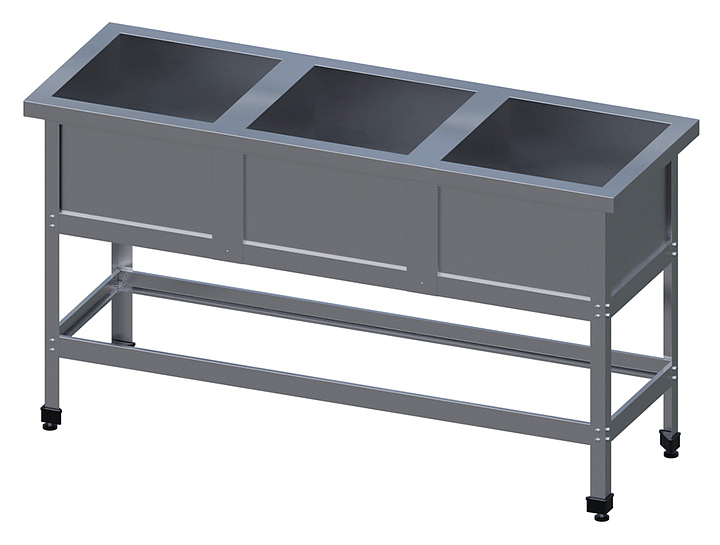 Ванна VIATTO ВСМ-3/530-ЮТ предназначена для мытья посуды, кухонного инвентаря и гастрономических продуктов на предприятиях пищевой промышленности и общественного питания. Емкость выполнена из нержавеющей стали AISI 430 толщиной 0,8 мм, каркас - из оцинкованной стали толщиной 1 мм. Ножки регулируются по высоте.