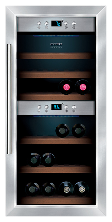 Винный шкаф CASO WineComfort 24 предназначен для охлаждения и длительного хранения бутилированного и разливного вина в частных домах, квартирах, отелях и офисах. Модель оснащена 2 зонами хранения с независимой установкой температуры и отдельной панелью управления c LED-дисплеем для каждой из них и 6 деревянными выдвижными полками. Дверная рама и ручка выполнены из нержавеющей стали, дверца - из стекла с ультрафиолетовым фильтром.