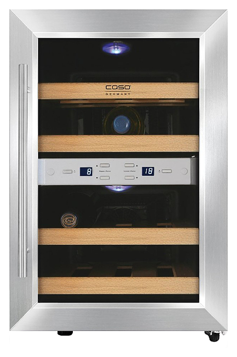 Винный шкаф CASO WineDuett 12 предназначен для охлаждения и длительного хранения бутилированного и разливного вина в частных домах, квартирах, отелях и офисах. Модель оснащена 2 зонами хранения с независимой установкой температуры в каждой из них, панелью управления с 2 LED-дисплеями и 4 выдвижными деревянными полками. Дверная рама и ручка выполнены из нержавеющей стали, дверца - из стекла с ультрафиолетовым фильтром.