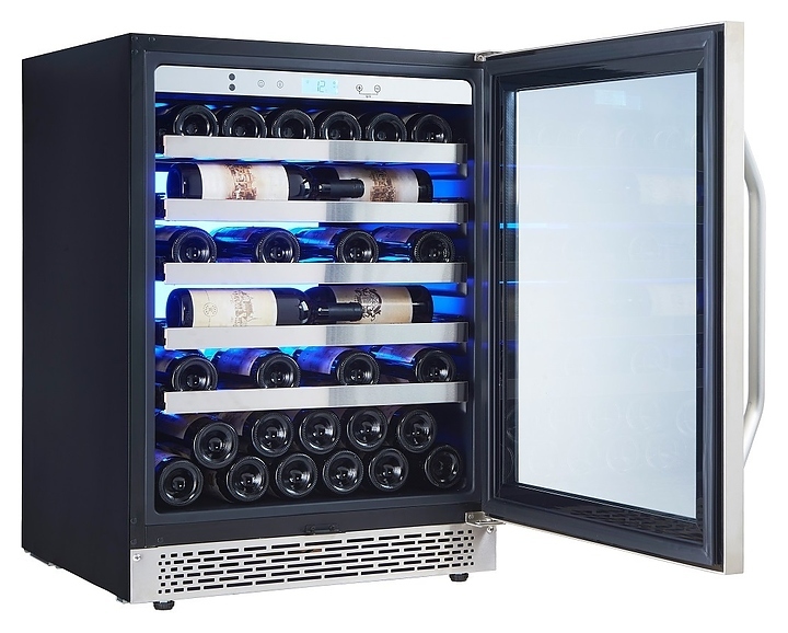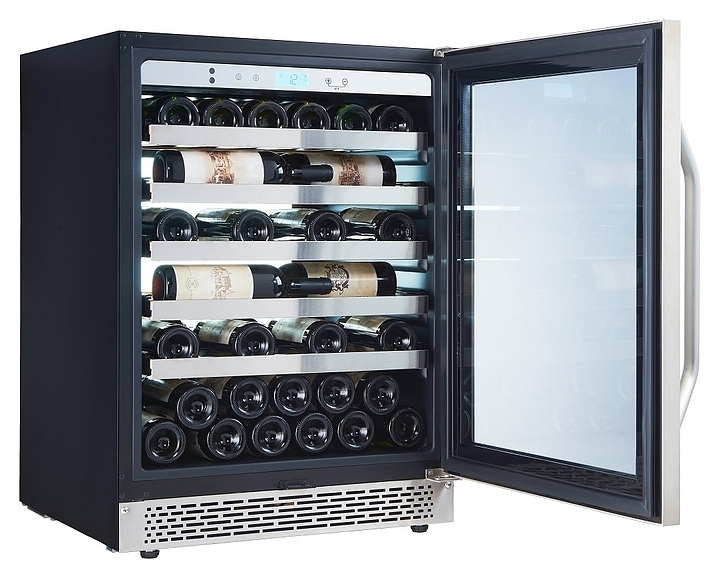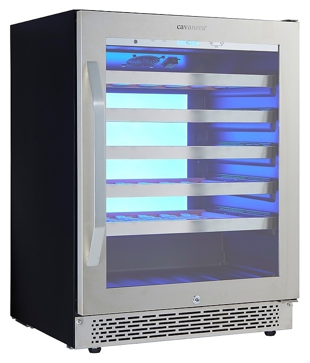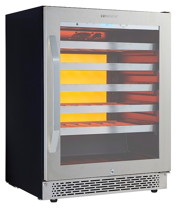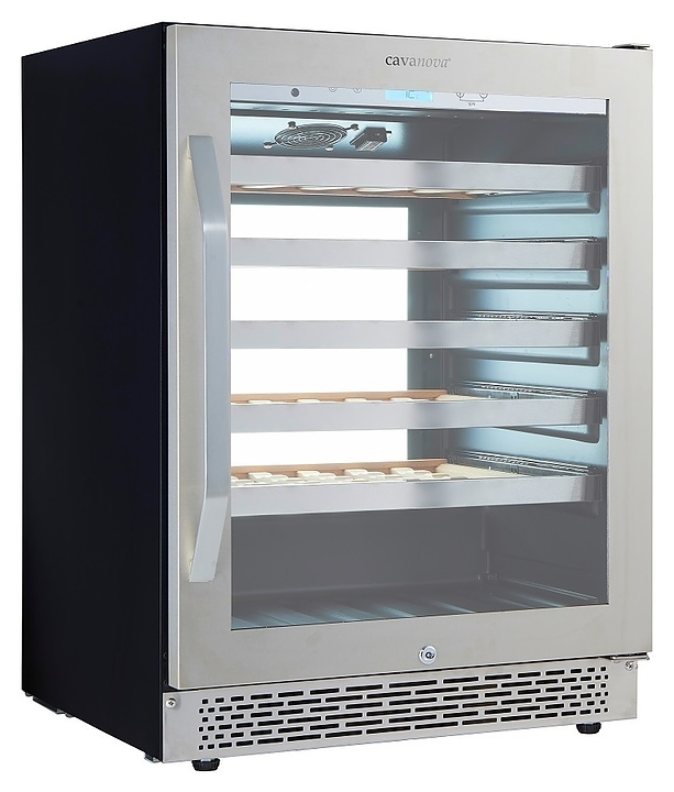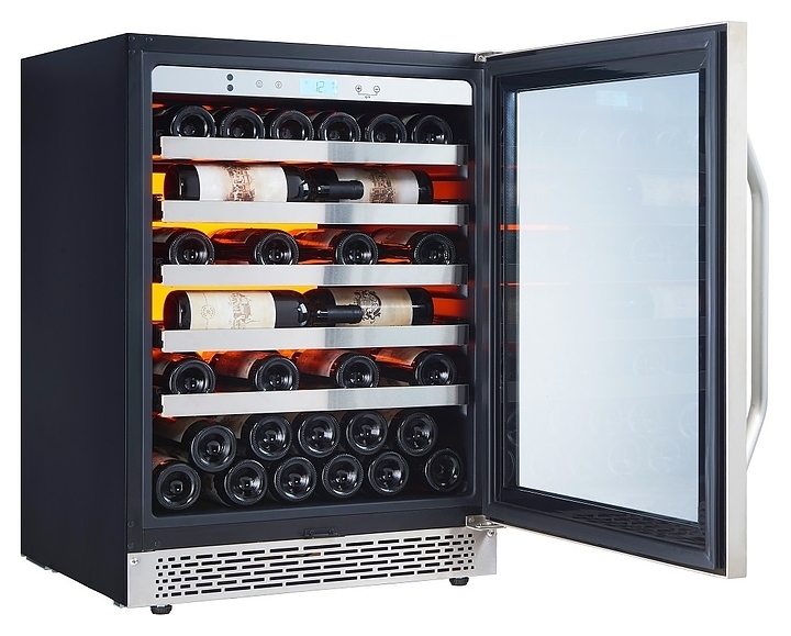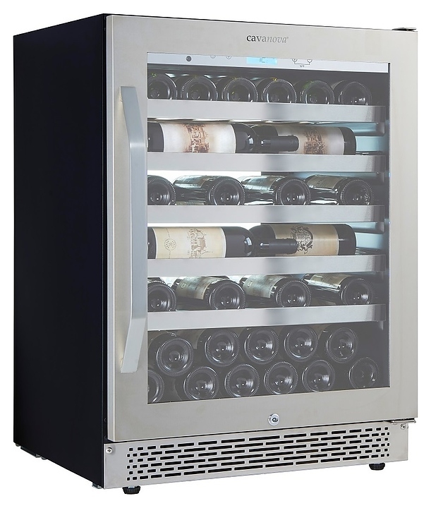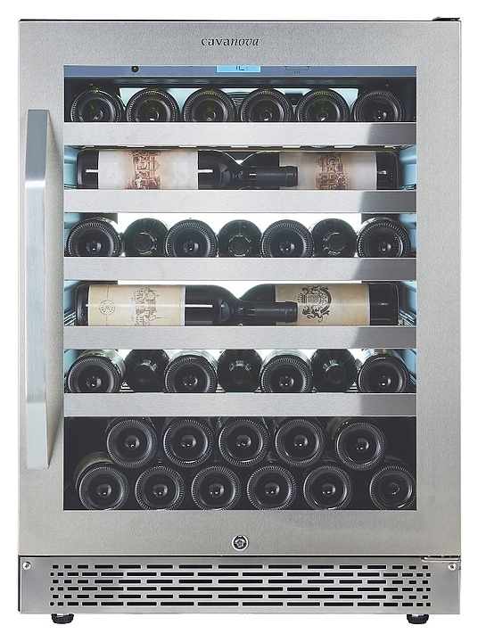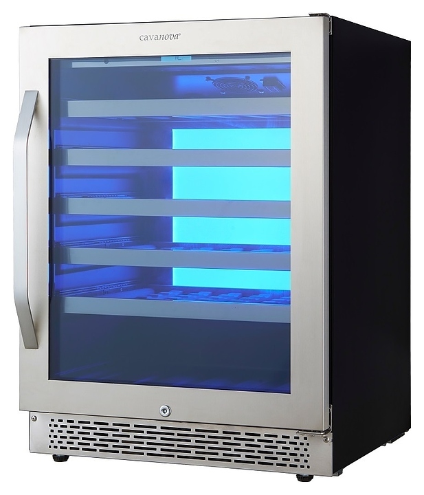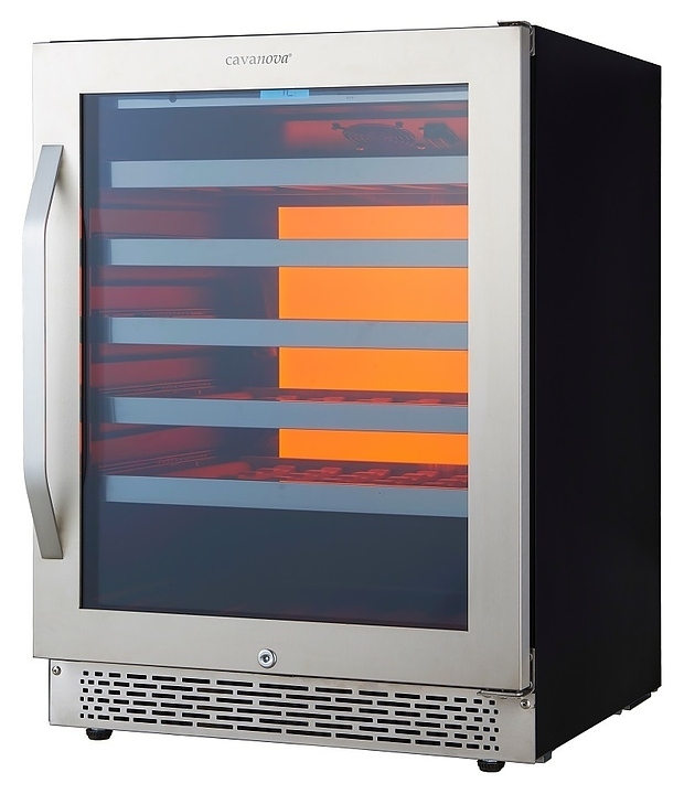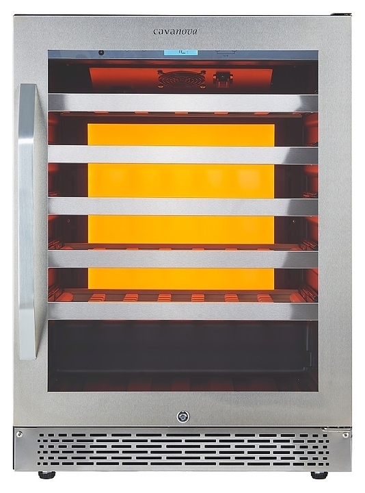 Винный шкаф Cavanova CV045-1TL предназначен для хранения при оптимальных условиях и демонстрации бутилированного вина различных сортов в барах, ресторанах, специализированных магазинах, подсобных складских помещениях, а также в домашних условиях. Модель оснащена монотемпературной холодильной камерой, правосторонней распашной дверью с длинной вертикальной рукояткой, прозрачным обзорным остеклением, цокольной решеткой и расположенной за дверью в верхней части фронта сенсорной панелью управления с жидкокристаллическим дисплеем индикации. Корпус выполнен из металла с антикоррозийным покрытием черного цвета, фронт рамы двери и рукоятка с поверхностью серебристого оттенка, полки – из массива древесины.