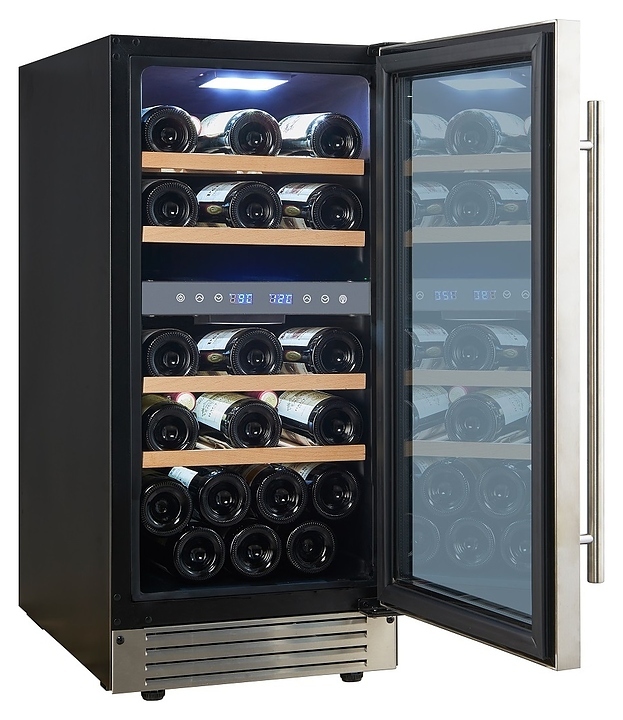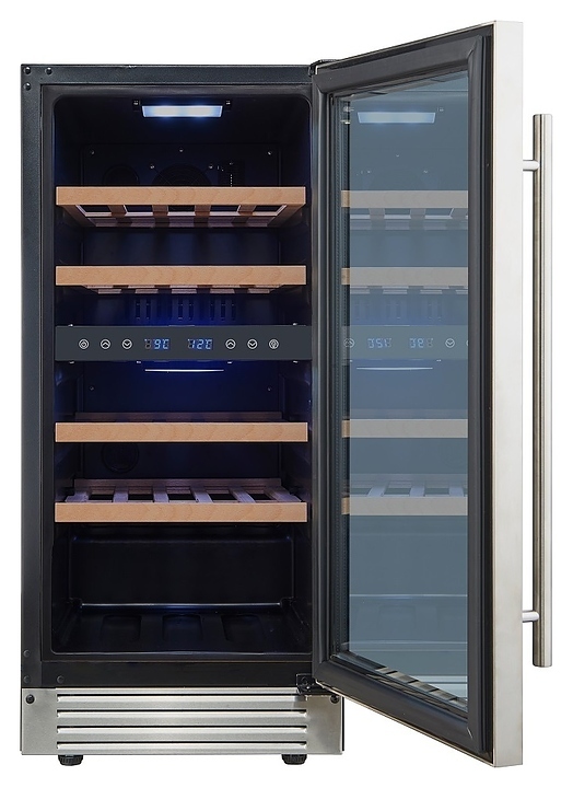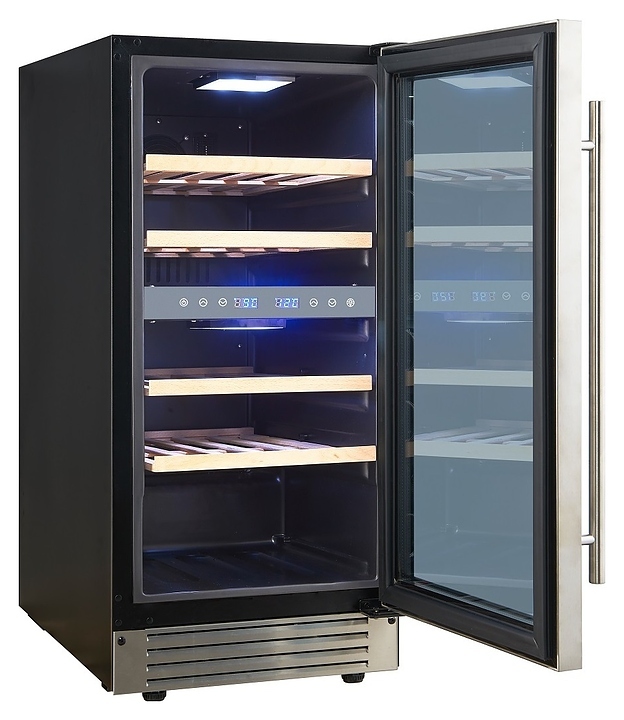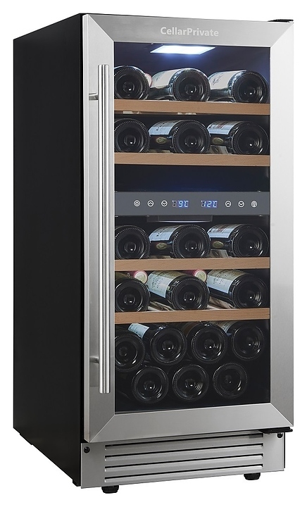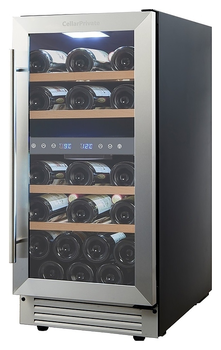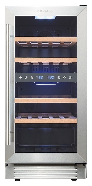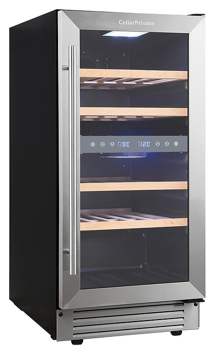 Встраиваемый винный шкаф Cellar Private CP027-2T предназначен для хранения при оптимальных условиях бутилированного вина различных сортов в барах, ресторанах, специализированных магазинах, подсобных складских помещениях, а также в домашних условиях. Модель оснащена холодильной камерой с 2 температурными зонами, 4 съемными полками, распашной перенавешиваемой дверью с длинной вертикальной рукояткой и прозрачным тонированным обзорным стеклом, а также сенсорной панелью управления с 2 цифровыми дисплеями внутри камеры. Корпус выполнен из металла с покрытием черного цвета, дверь и рукоятка серебристого цвета, полки – из массива древесины.