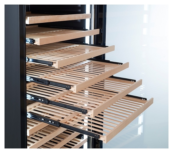 - Полки на роликовых направляющих с фронтальными бортиками для плавного выдвижения и предотвращения выпадения бутылок