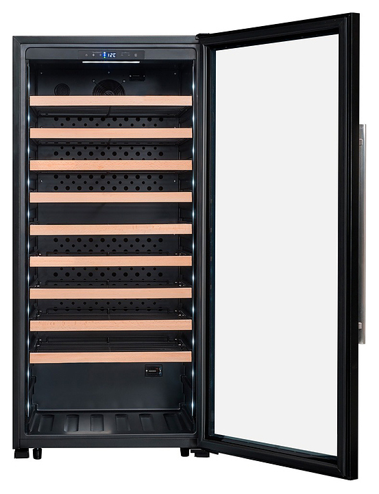 - Бутылки на полках лежат этикеткой к стеклу, что позволяет использовать винный шкаф не только для хранения, но и для демонстрации винной коллекции