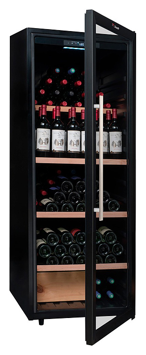 - Бутылки на полках лежат этикеткой к стеклу, что позволяет использовать винный шкаф не только для хранения, но и для демонстрации винной коллекции
