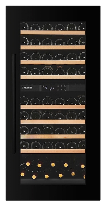 Винный шкаф Dunavox DXJ-65.154DB серии JOY-65 предназначен для охлаждения, хранения при оптимальных условиях и демонстрации бутилированного вина различных сортов в барах, ресторанах, специализированных магазинах, подсобных складских помещениях, гостиницах, а также домашних условиях. Модель оснащена холодильной камерой с 2 температурными зонами, перенавешиваемой распашной дверью с магнитным уплотнением, обзорным остеклением, вертикальной рукояткой, расположенной внутри камеры сенсорной панелью управления и жидкокристаллическим дисплеем. Корпус выполнен из стали, фронт дверной рамы черного цвета, полки – из массива буковой древесины.