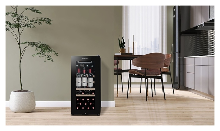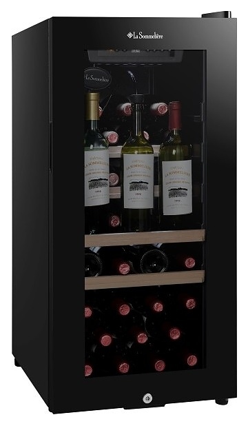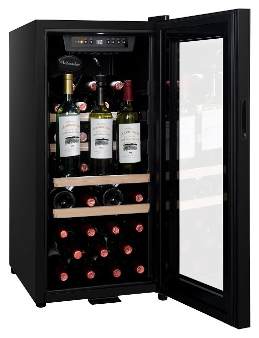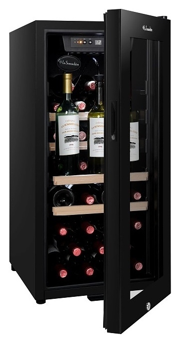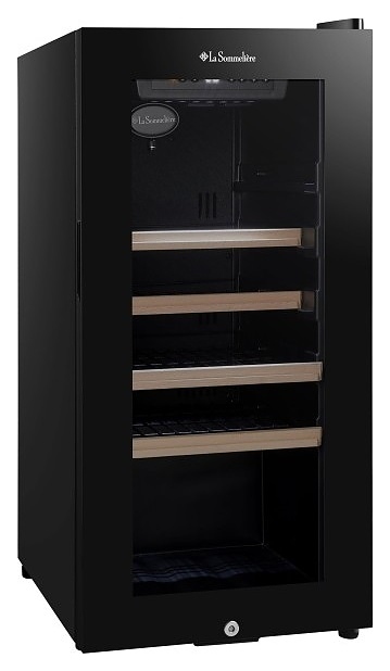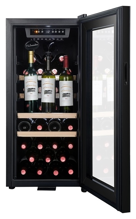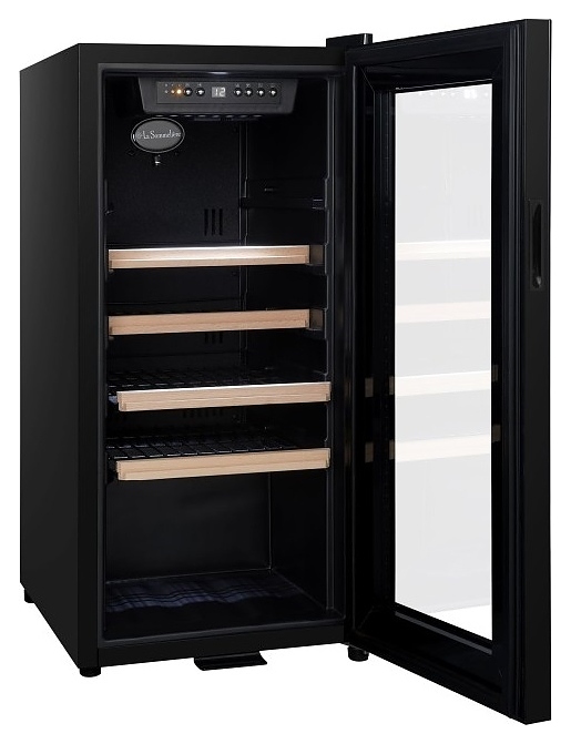 Винный шкаф La Sommeliere LS38BLACK предназначен для хранения при оптимальных условиях и демонстрации бутилированного вина различных сортов в барах, ресторанах, специализированных магазинах, складских помещениях, а также домашних условиях. Модель оснащена холодильной камерой с правосторонней распашной дверью на внешних петлях, обзорным остеклением, кабелем питания с вилкой, расположенной внутри камеры панелью управления с сенсорными клавишами, светодиодными лампами и цифровым дисплеем индикации. Корпус и рама двери выполнены из металла с антикоррозийным покрытием черного цвета, внутренняя облицовка камеры черного цвета, полки – из стали с фронтом из массива буковой древесины.