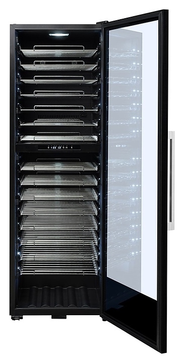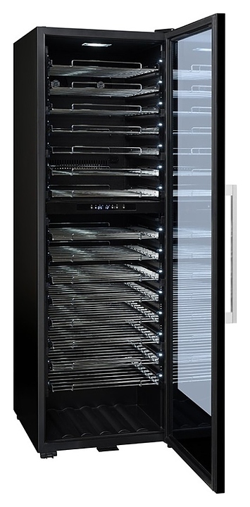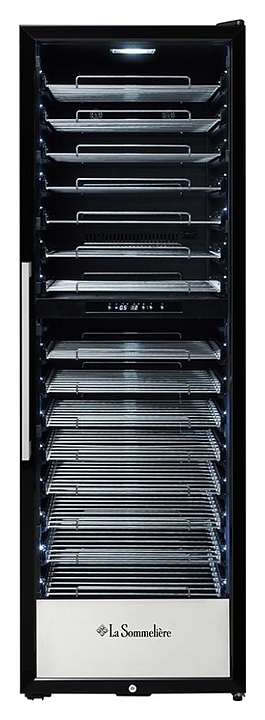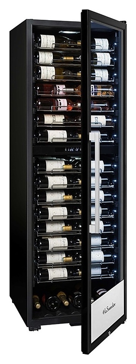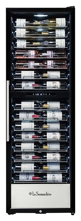 Винный шкаф La Sommeliere PRO160DZN предназначен для хранения при оптимальных условиях и демонстрации бутилированного вина различных сортов в барах, ресторанах, специализированных магазинах, складских помещениях, а также домашних условиях. Модель оснащена холодильной камерой с 2 независимыми температурными зонами, правосторонней перенавешиваемой распашной дверью на внешних петлях, вертикальной рукояткой, обзорным остеклением, кабелем питания с вилкой, расположенной внутри камеры панелью управления с сенсорными клавишами, светодиодными лампами и цифровым дисплеем с белой подсветкой индикации. Корпус выполнен из металла с антикоррозийным покрытием черного цвета, рукоятка – из металла с сатинированной серебристой поверхностью, внутренняя облицовка камеры черного цвета, полки – из стали.