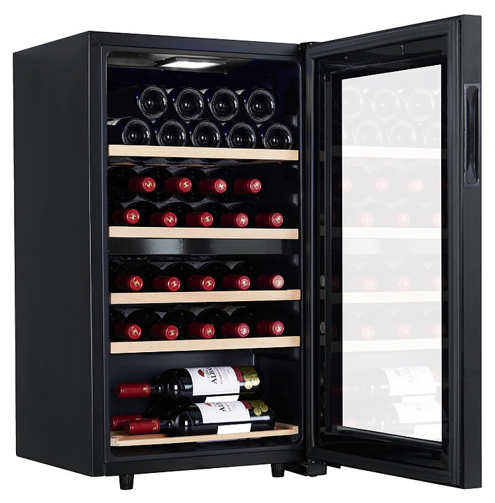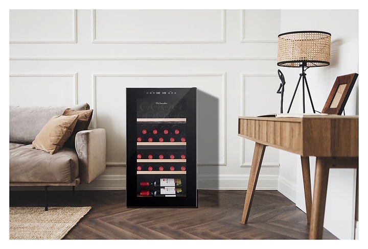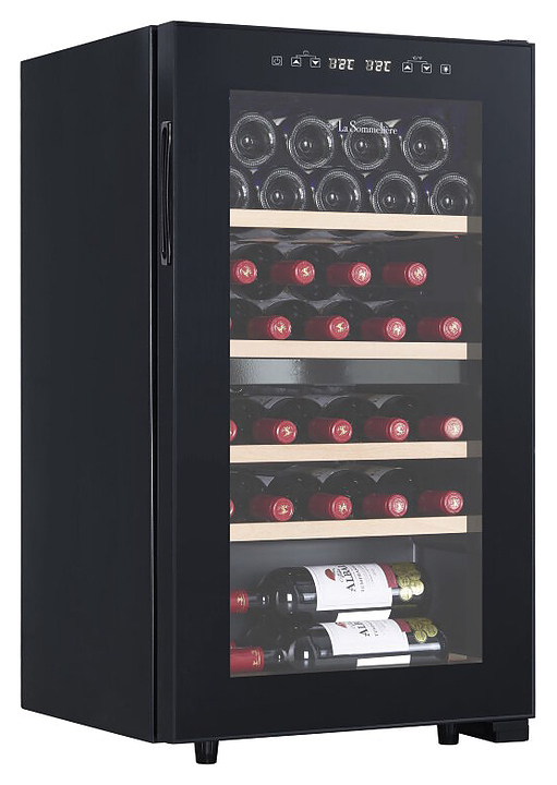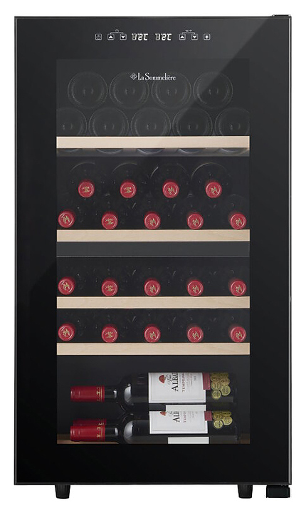 Винный шкаф La Sommeliere SLS32DZBLACK предназначен для хранения бутилированного вина в ресторанах, специализированных магазинах, подсобных складских помещениях, в частных домах или квартирах. Модель оснащена 2 независимыми температурными отсеками, сенсорным цифровым дисплеем с электронным термометром, белой светодиодной подсветкой с выключателем, 4 съемными полками, 2 регулируемыми ножками и 2 колесами. Дверь выполнена из двойного серого двойного закаленного стеклопакета с защитой от УФ-излучений, полки - из натурального дерева.