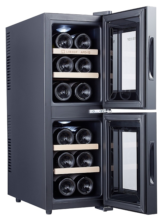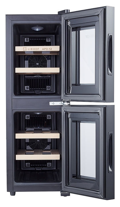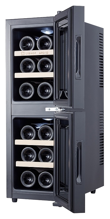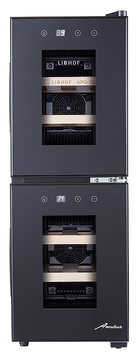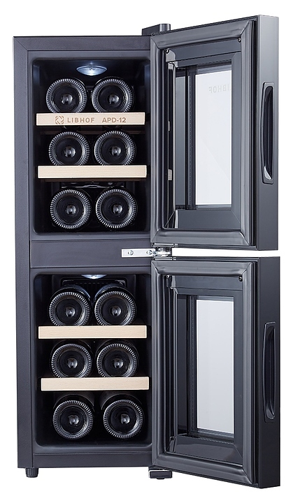 Винный шкаф Libhof Amateur APD-12 предназначен для хранения белых и красных вин, требующих дозревания перед употреблением, а также уже готовых к сервировке в барах, ресторанах, специализированных магазинах, подсобных складских помещениях или в домашних условиях. Модель оснащена холодильной камерой с 2 температурными зонами, 4 полками, 2 распашными дверьми на внешних петлях с ручками, прозрачным обзорным остеклением, дисплеем и цифровым термометром на каждой двери. Корпус выполнен из металла, полки - из массива дерева.