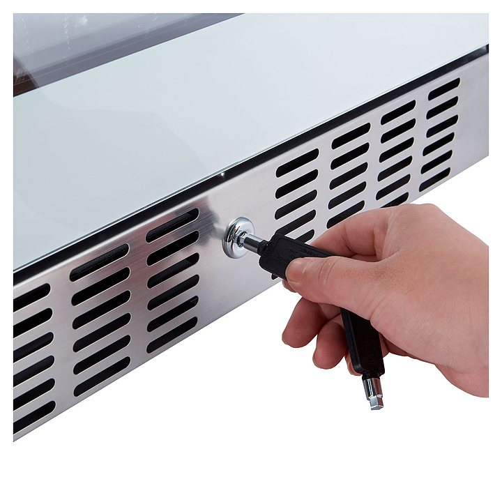 В комплект поставки входят 6 полок с направляющими для размещения бутылок, ключ от дверного замка и инструкция по эксплуатации.