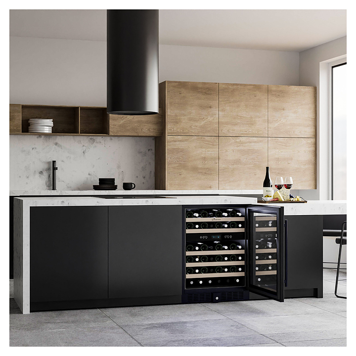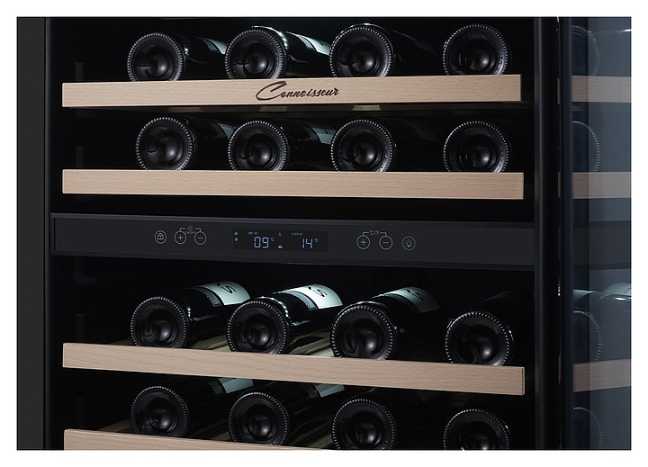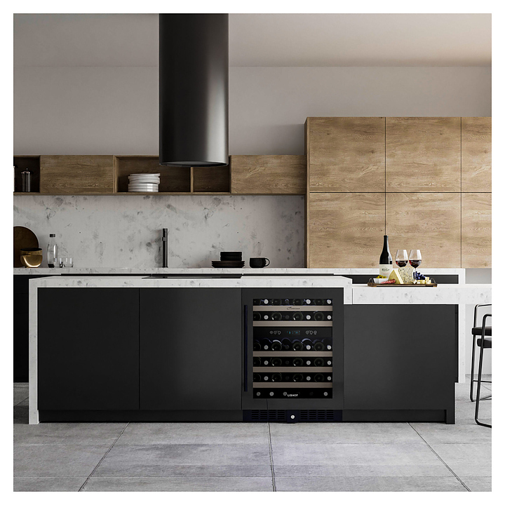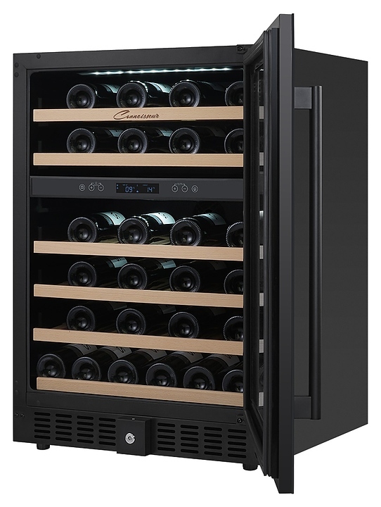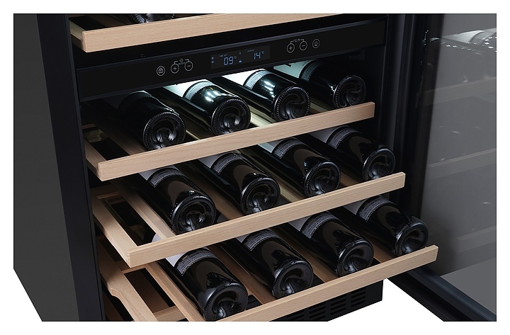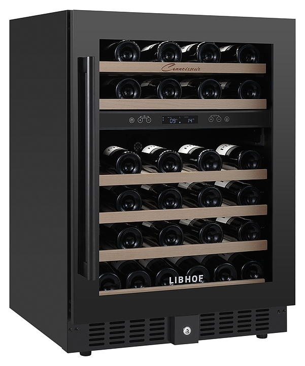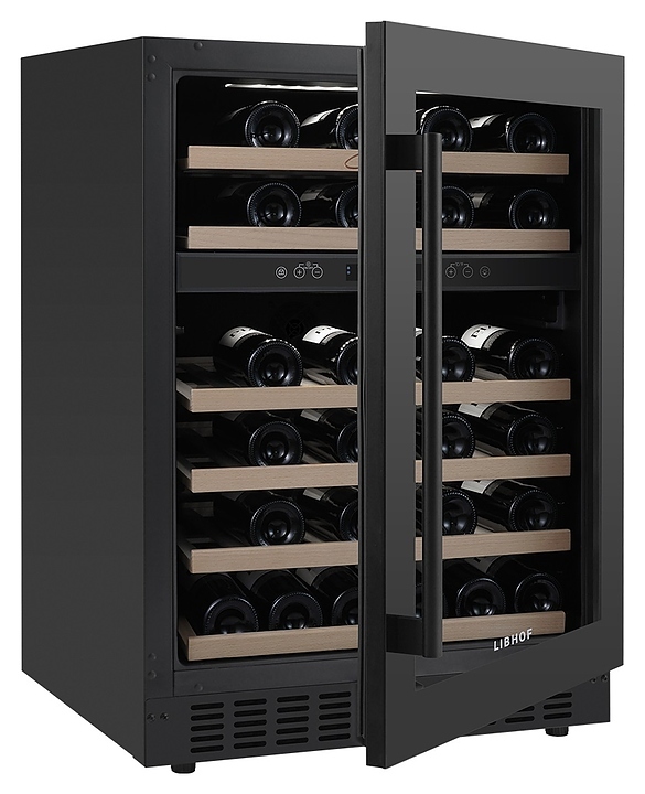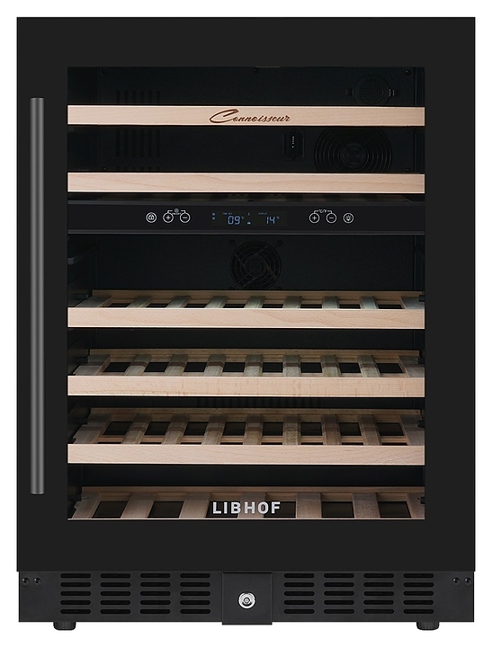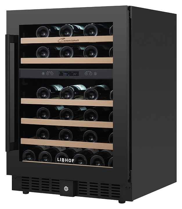Встраиваемый винный шкаф Libhof Connoisseur CXD-46 Black предназначен для хранения при оптимальных условиях бутилированного вина различных сортов в барах, ресторанах, специализированных магазинах, подсобных складских помещениях, а также в домашних условиях. Модель оснащена холодильной камерой, 6 полками с направляющими для размещения бутылок, запираемой на ключ распашной дверью с внутренними петлями, длинной вертикальной рукояткой, прозрачным дымчатым обзорным стеклом и сенсорной панелью управления с цифровым дисплеем с индикацией синего цвета. Корпус и рукоятка выполнены из металла с антикоррозийным покрытием черного цвета, полки – из массива буковой древесины.