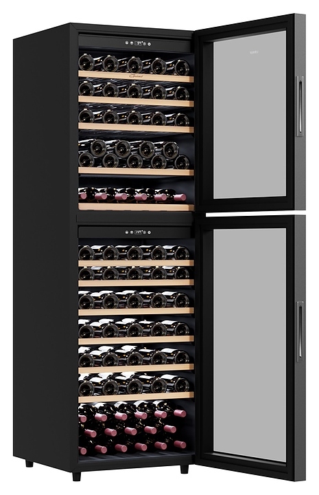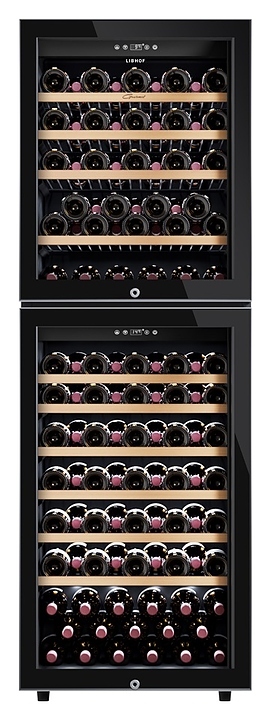 Винный шкаф Libhof Gourmet GQD-120 Black предназначен для хранения при оптимальных условиях бутилированного вина различных сортов в барах, ресторанах, специализированных магазинах, подсобных складских помещениях, а также в домашних условиях. Модель оснащена 2 холодильными камерами с запираемыми на ключ распашными дверьми на скрытых внутренних петлях, прозрачными обзорными стеклами, внутренними сенсорными панелями управления и цифровыми дисплеями с белой подсветкой индикации. Корпус выполнен из металла с антикоррозийным покрытием черного цвета, боковой профиль рамы дверей – из металла с серебристой поверхностью, полки – из массива буковой древесины.