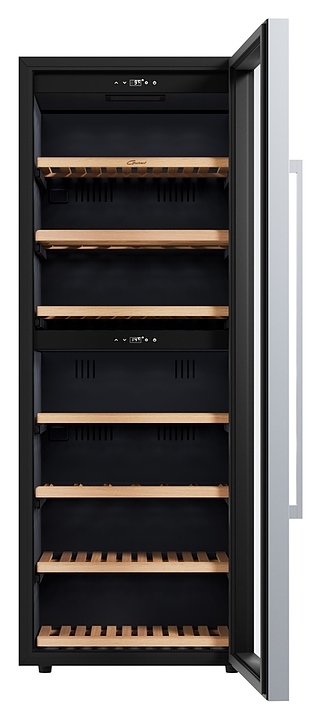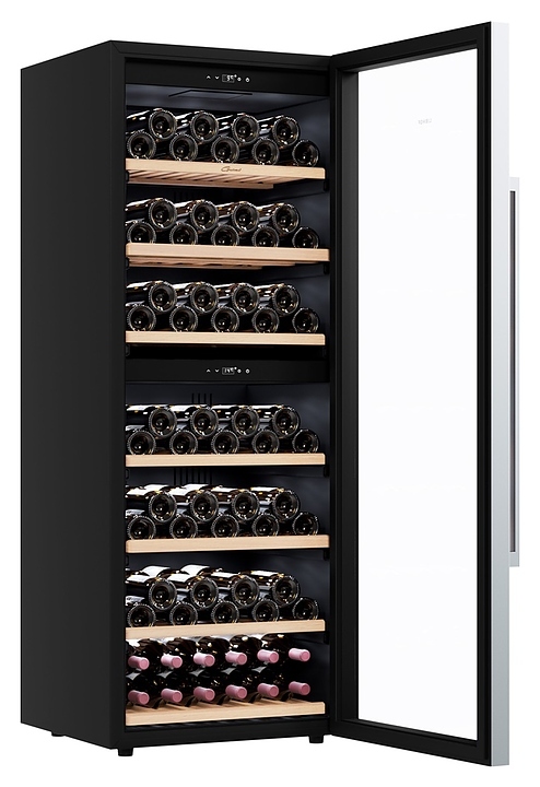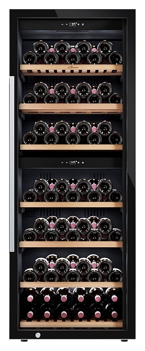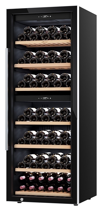 Винный шкаф Libhof Gourmet GQD-126 Black предназначен для хранения при оптимальных условиях бутилированного вина различных сортов в барах, ресторанах, специализированных магазинах, подсобных складских помещениях, а также в домашних условиях. Модель оснащена холодильной камерой с 2 независимыми температурными зонами, запираемой на ключ распашной дверью на скрытых внутренних петлях, длинной вертикальной рукояткой, прозрачным обзорным стеклом, внутренней сенсорной панелью управления и цифровым дисплеем с белой подсветкой индикации. Корпус выполнен из металла с антикоррозийным покрытием черного цвета, боковой профиль рамы двери и рукоятка – из металла с серебристой поверхностью, полки – из массива буковой древесины.