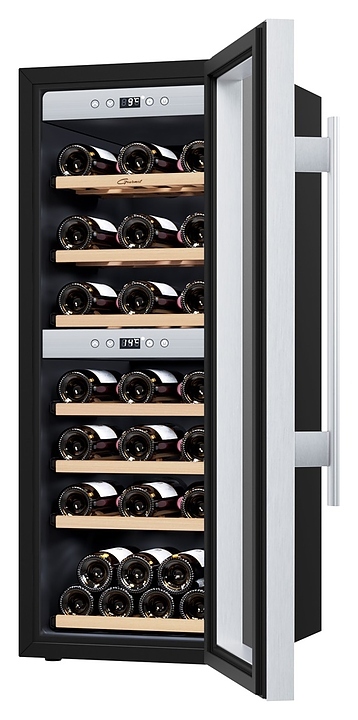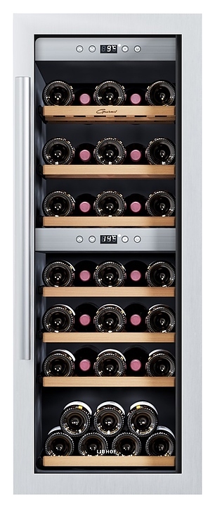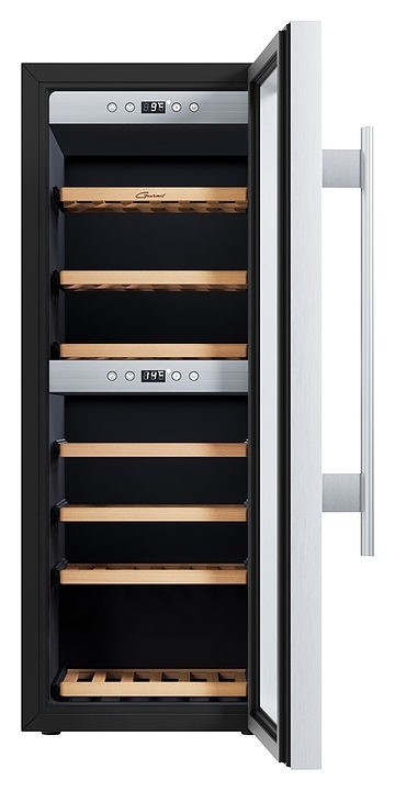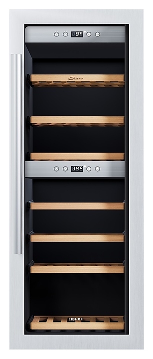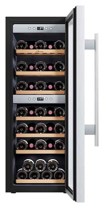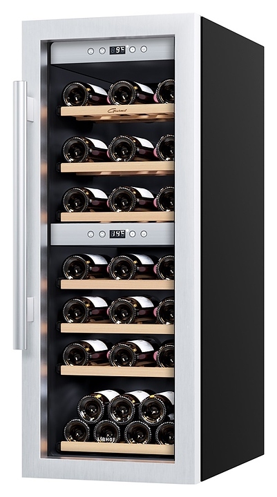 Винный шкаф Libhof Gourmet GQD-38 Silver предназначен для хранения при оптимальных условиях бутилированного вина различных сортов в барах, ресторанах, специализированных магазинах, подсобных складских помещениях, а также в домашних условиях. Модель оснащена холодильной камерой с 2 независимыми температурными зонами, распашной дверью на скрытых внутренних петлях, длинной вертикальной рукояткой, прозрачным обзорным стеклом, внутренней сенсорной панелью управления и цифровым дисплеем с белой подсветкой индикации. Корпус выполнен из металла с антикоррозийным покрытием черного цвета, рама двери, внутренние фасадные панели и рукоятка – из металла с серебристой поверхностью, полки – из массива буковой древесины.