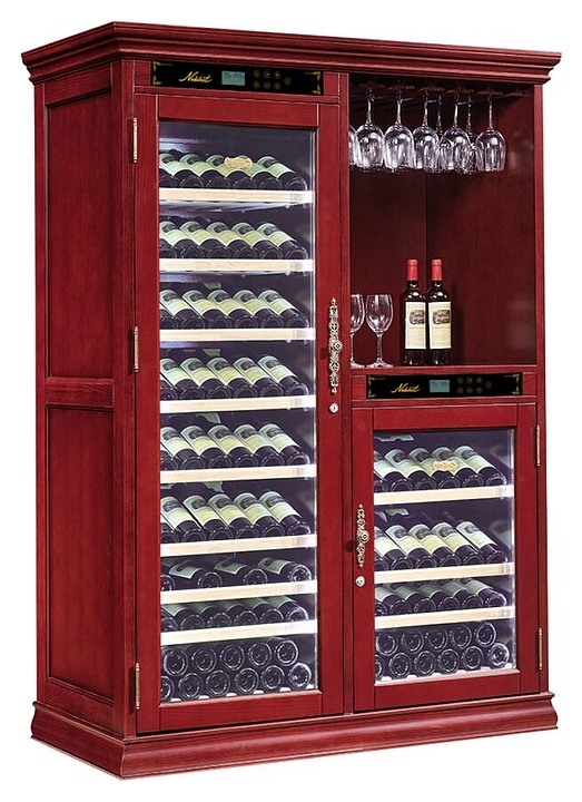 Винный шкаф Libhof Noblest NBD-145 предназначен для хранения при оптимальных условиях бутилированного вина различных сортов в барах, ресторанах, специализированных магазинах, подсобных складских помещениях, а также в домашних условиях. Модель оснащена 2 холодильными камерами с 8 демонстрационными полками, 2 полками с ванночкой и 2 укороченными полками, распашными дверьми на внутренних петлях с замками, прозрачными обзорными стеклами и сенсорной панелью управления с дисплеем на каждой камере. Корпус выполнен из американского дуба, полки - из массива бука.