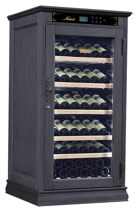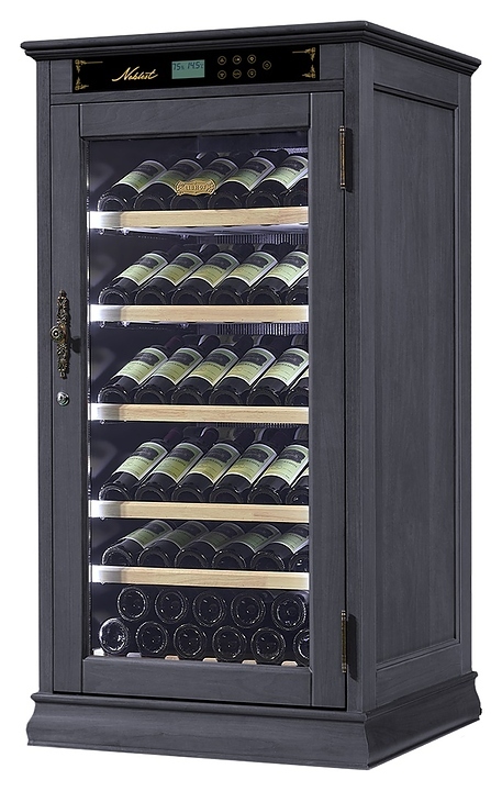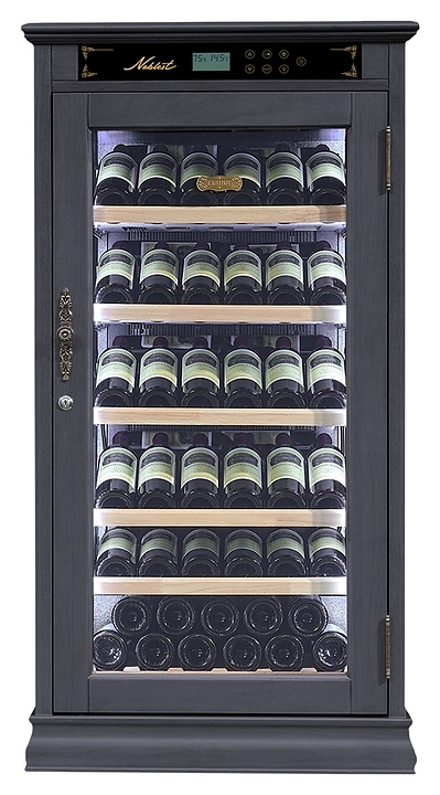 Винный шкаф Libhof Noblest NR-69 Black предназначен для хранения при оптимальных условиях бутилированного вина различных сортов в барах, ресторанах, специализированных магазинах, подсобных складских помещениях, а также в домашних условиях. Модель оснащена монотемпературной холодильной камерой, распашной дверью на внешних петлях, прозрачным обзорным стеклом, внешней сенсорной панелью управления и дисплеем индикации. Корпус выполнен из древесины американского дуба с покрытием черного цвета, фурнитура – из металла цвета бронзы с патиной, съемные полки – из массива буковой древесины.