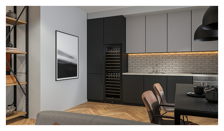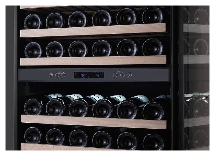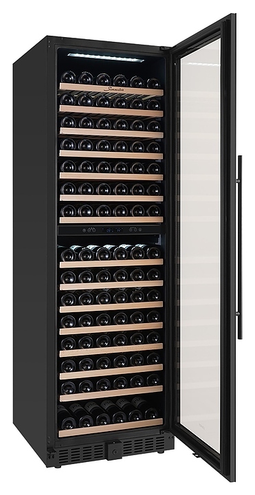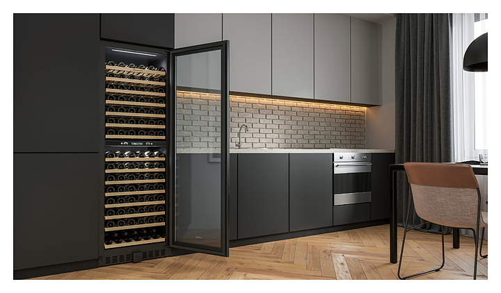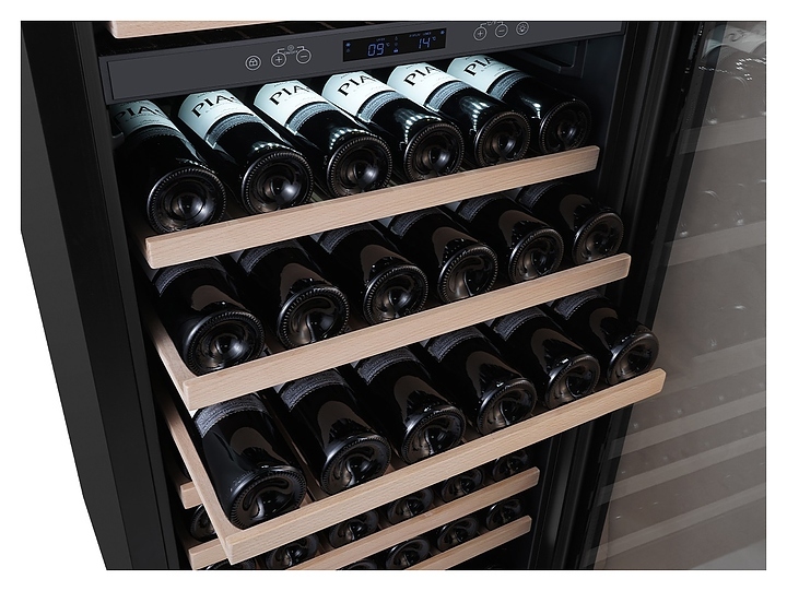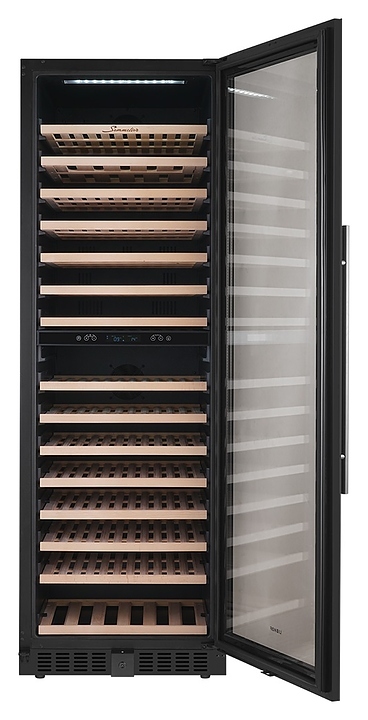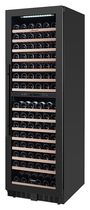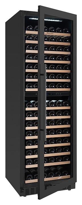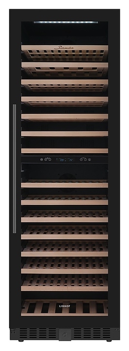 Встраиваемый винный шкаф Libhof Sommelier SMD-165 Black предназначен для хранения при оптимальных условиях бутилированного вина различных сортов в барах, ресторанах, специализированных магазинах, подсобных складских помещениях, а также в домашних условиях. Модель оснащена холодильной камерой, 15 полками с направляющими для размещения бутылок, запираемой на ключ распашной дверью на внутренних петлях, длинной вертикальной рукояткой, прозрачным дымчатым обзорным стеклом и сенсорной панелью управления с цифровым дисплеем с индикацией синего цвета. Корпус и рукоятка выполнены из металла с антикоррозийным покрытием черного цвета, полки – из массива буковой древесины.