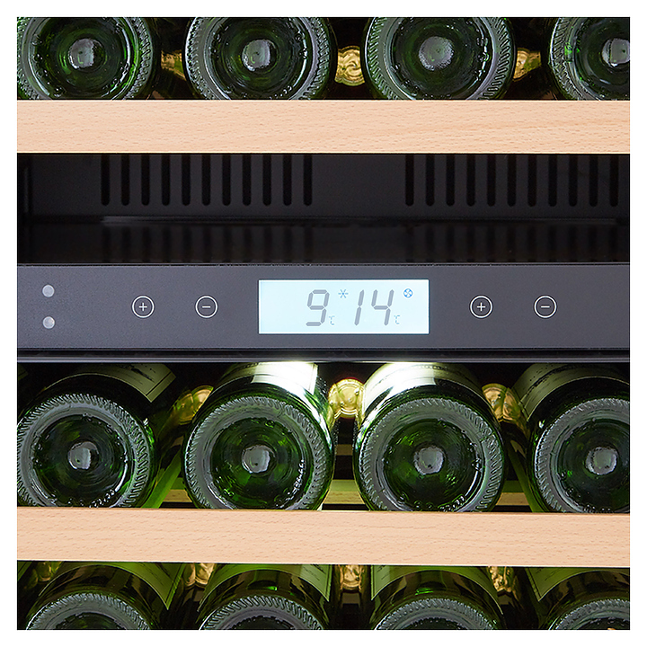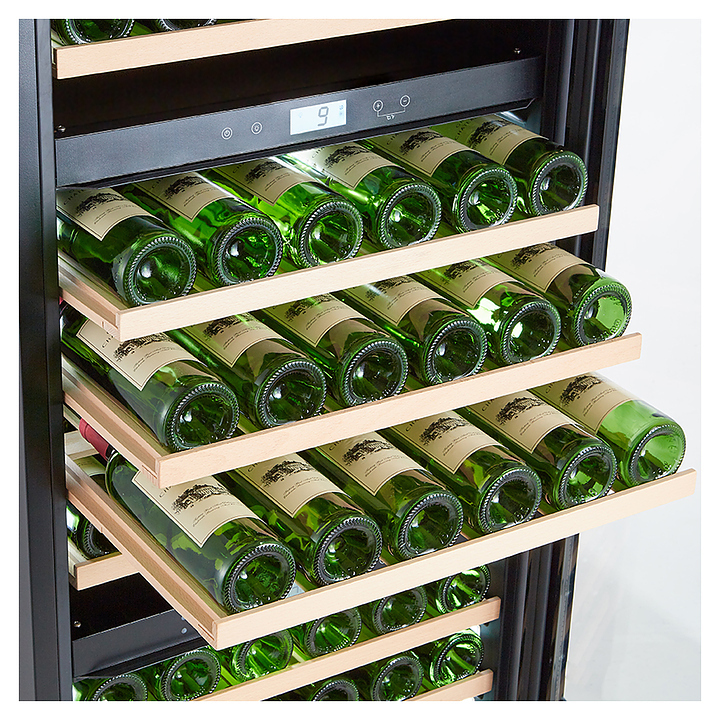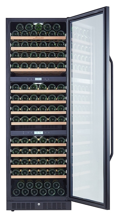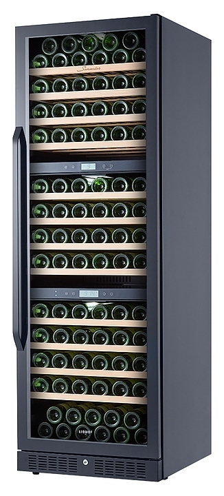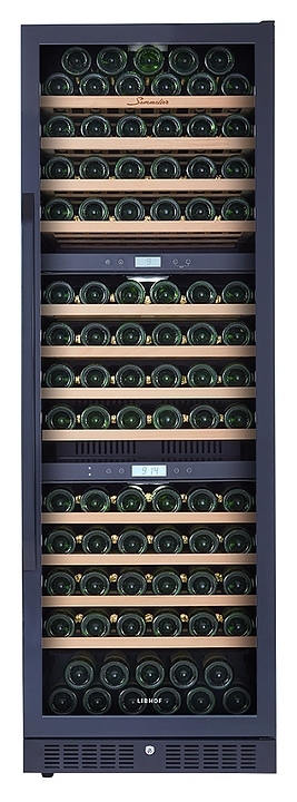 Винный шкаф Libhof Sommelier SOT-152 предназначен для хранения при оптимальных условиях бутилированного вина различных сортов в барах, ресторанах, специализированных магазинах, подсобных складских помещениях, а также в домашних условиях. Модель оснащена холодильной камерой с 3 температурными зонами, 12 съемными полками, запираемой на ключ дверью на внешних петлях, съемной цокольной решеткой, прозрачным обзорным остеклением, сенсорной панелью управления и дисплеем для каждой зоны. Корпус выполнен из металла, полки - из натурального бука.