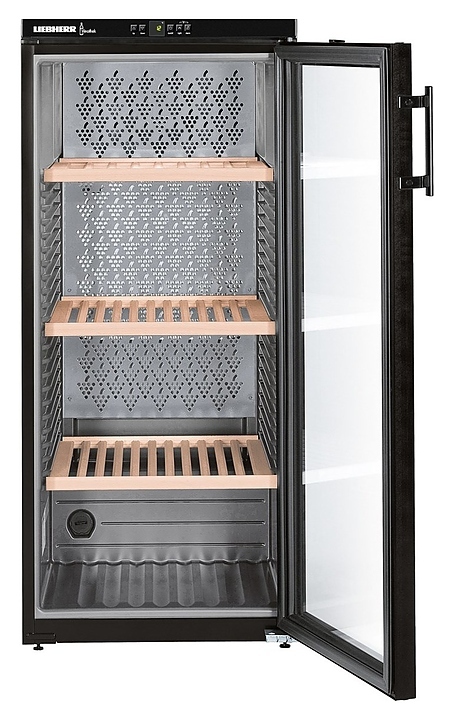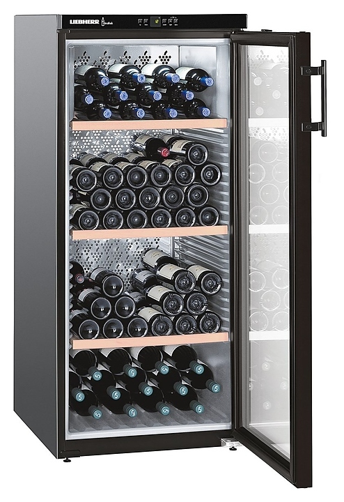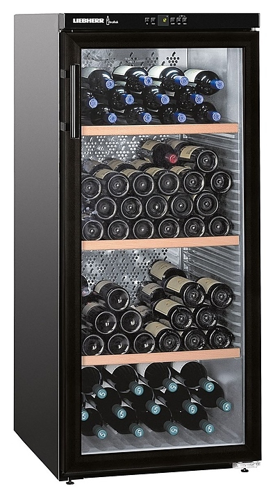 Винный шкаф Liebherr? WKb 3212 серии Vinothek предназначен для охлаждения и длительного хранения разливного вина в частных домах, квартирах, отелях и офисах. Модель оснащена изолирующей дверью с тонированным стеклопакетом, жидкокристаллическим дисплеем MagicEye и цифровой индикацией температуры. Корпус выполнен из нержавеющей стали, полки - из натурального дерева.