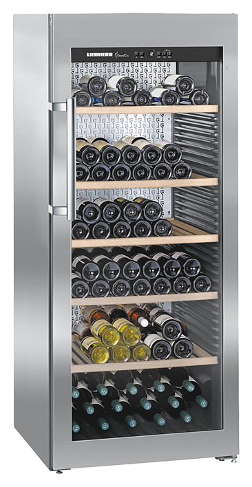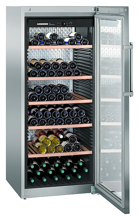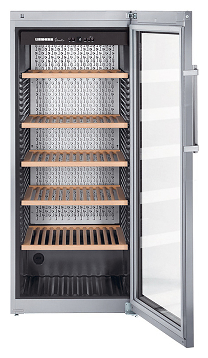 Винный шкаф Liebherr? WKes 4552 серии GrandCru предназначен для охлаждения и длительного хранения разливного вина в частных домах, квартирах, отелях и офисах. Модель оснащена кнопочным управлением, дисплеем MagicEyeи цифровой индикацией температуры. Внутренняя прокладка выполнена из серого полистирола, корпус - из нержавеющей стали, дверь - из стекла с УФ-покрытием с и рамой из нержавеющей стали, полки - из дерева акации.