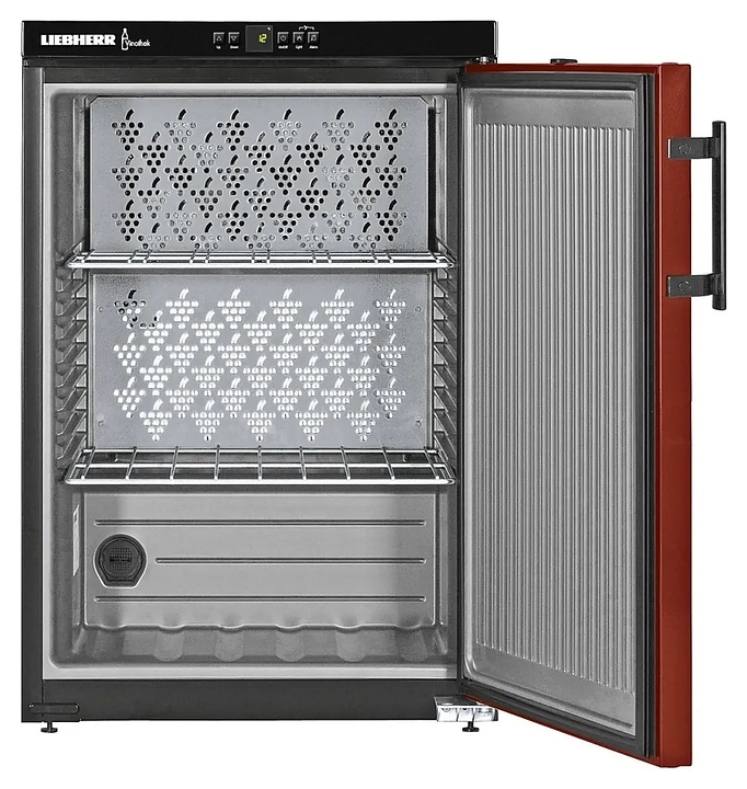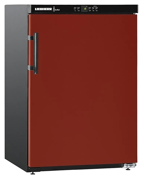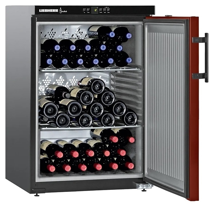 Винный шкаф Liebherr WKr 1811 предназначен для охлаждения и хранения при оптимальных условиях бутилированного вина различных сортов в барах, ресторанах, специализированных магазинах, подсобных складских помещениях, а также домашних условиях. Модель оснащена холодильной камерой с правосторонней распашной дверью дизайна HardLine на перенавешиваемых петлях с короткой вертикальной рукояткой, кабелем питания с евровилкой и расположенной в верхней части фронта панелью управления с функциональными нажимными клавишами и светодиодным цифровым дисплеем. Боковины выполнены из стали с антикоррозийным покрытием черного цвета, дверь – из стали с покрытием бордово-красного оттенка, полки – из металла с хромированной поверхностью, упаковка – из гофрокартона, полимерной пленки и полистирола.