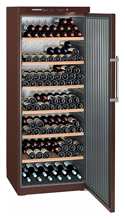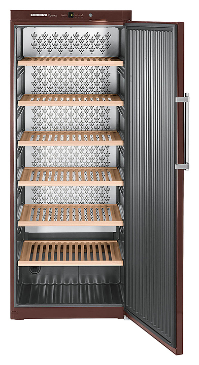 Винный шкаф Liebherr? WKt 6451 серии GrandCru предназначен для охлаждения и длительного хранения разливного вина в частных домах, квартирах, отелях и офисах. Модель оснащена кнопочным управлением, дисплеем MagicEye и цифровой индикацией температуры. Внутренняя прокладка выполнена из серого полистирола, корпус и дверь - из стали, полки - из дерева акации.