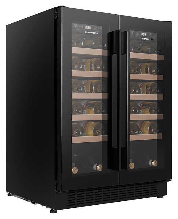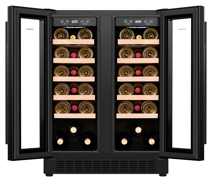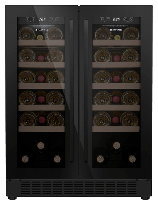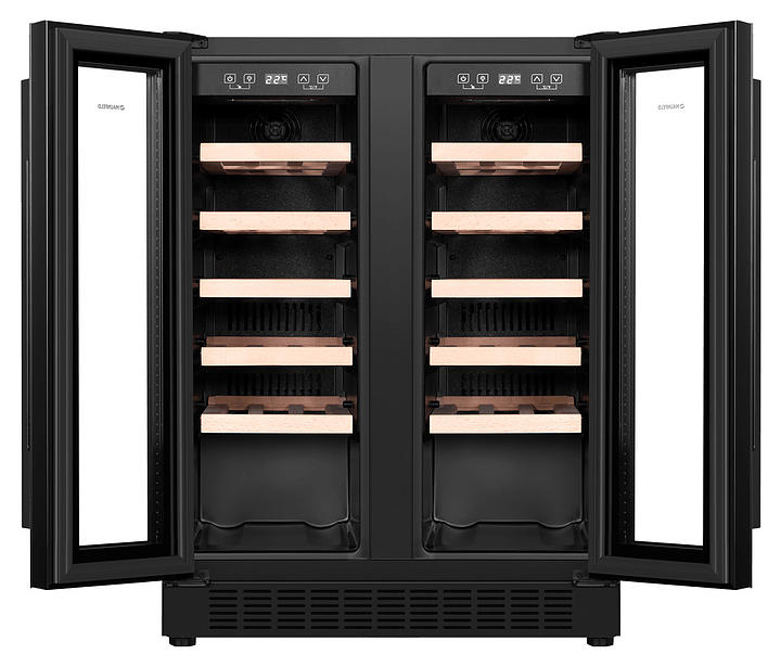 Винный шкаф Maunfeld MBWC-112S40 предназначен для хранения при оптимальных условиях и предпродажной демонстрации бутилированного вина различных сортов в барах, ресторанах, специализированных магазинах, подсобных складских помещениях, а также домашних условиях. Модель оснащена 2 холодильными камерами, каждая камера имеет распашную дверь с длинной уплощенной вертикальной рукояткой, расположенную внутри панель управления с функциональными сенсорными клавишами и светодиодным дисплеем с белой подсветкой индикации. Корпус выполнен из стали с антикоррозийным покрытием черного цвета, двери с полным фронтальным остеклением без винтового крепежа из прозрачного стекла с дымчатой тонировкой, внутренняя облицовка камер черного цвета, полки – из массива буковой древесины.