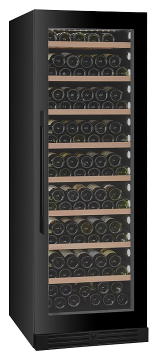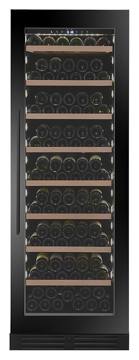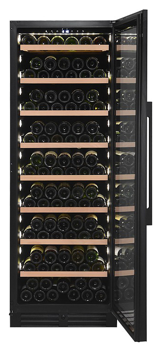 Винный шкаф MC Wine W180B предназначен для кратковременного хранения вина при определенном уровне влажности и температуры в ресторанах, специализированных магазинах, отелях, подсобных складских помещениях, в частных домах или квартирах и подготовки вина к подаче на стол. Модель оснащена сенсорным цифровым дисплеем с циферблатом и подсветкой голубого цвета, светодиодной подсветкой белого цвета, демонстрационным освещением по всей высоте шкафа, светодиодным индикатором температуры и черной трубчатой ручкой. Дверь выполнена из двухслойного низкоэмиссионного стекла с УФ-фильтром, рамка двери - из черного стекла, полки - из массива бука.
