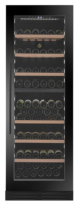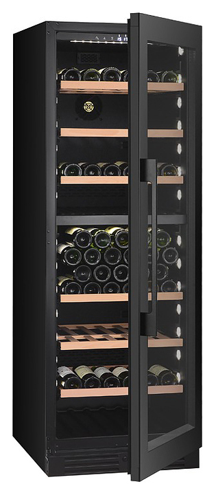 Винный шкаф MC Wine W180DB предназначен для кратковременного хранения вина при определенном уровне влажности и температуры в ресторанах, специализированных магазинах, отелях, подсобных складских помещениях, в частных домах или квартирах и подготовки вина к подаче на стол. Модель оснащена сенсорным цифровым дисплеем с циферблатом и подсветкой голубого цвета, светодиодной подсветкой белого цвета, демонстрационным освещением по всей высоте шкафа, светодиодным индикатором температуры и черной трубчатой ручкой. Дверь выполнена из двухслойного низкоэмиссионного стекла с УФ-фильтром, рамка двери - из черного стекла, полки - из массива бука.