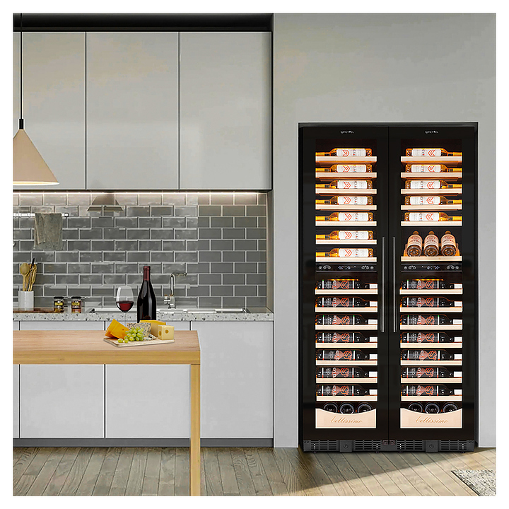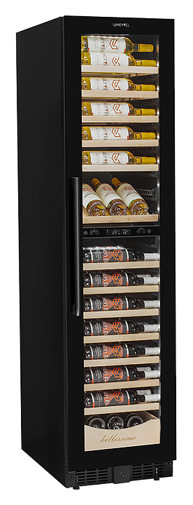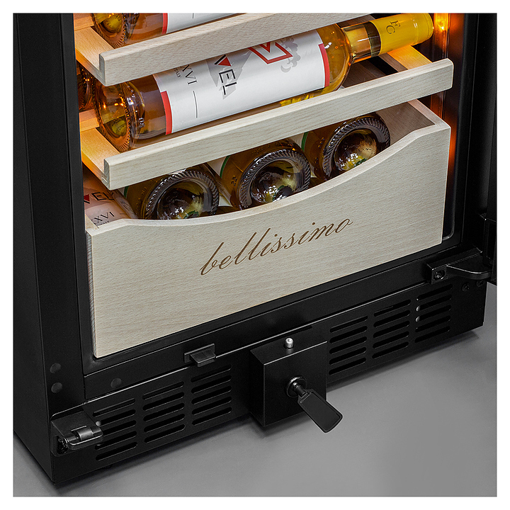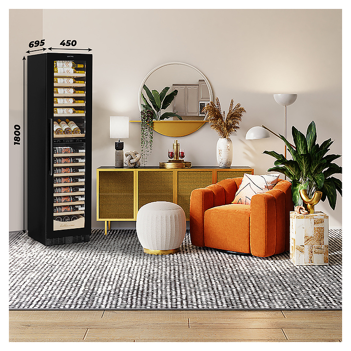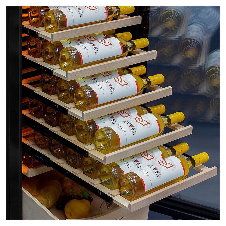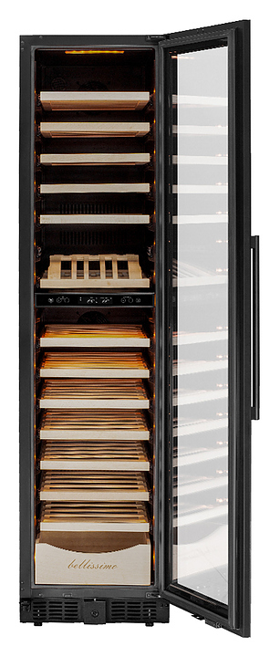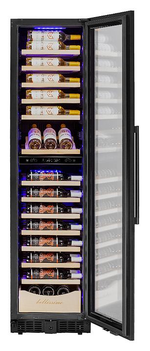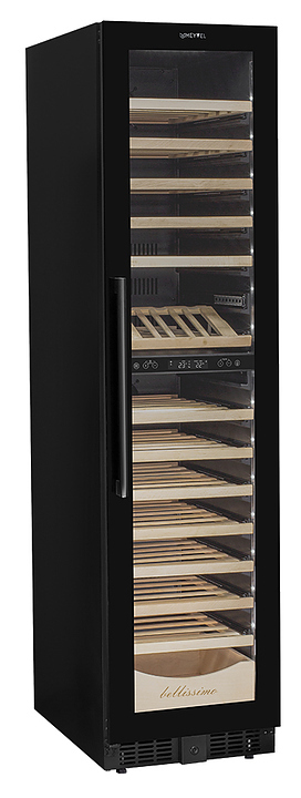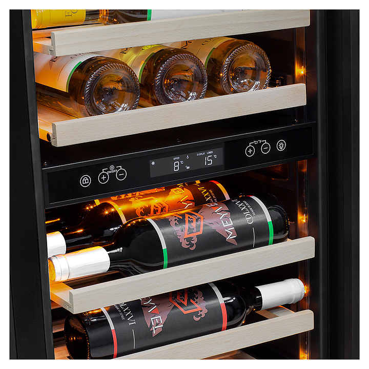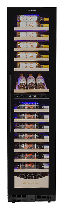 Винный шкаф MEYVEL MV106-KBT2 (Slim) предназначен для демонстрации, хранения и создания оптимальных условий для сохранения всех вкусовых свойств вина в бутылках на предприятиях общественного питания, торговли, в барах, ресторанах, специализированных магазинах, частных домах или квартирах. Модель оснащена сенсорной панелью управления, электронным термостатом и внутренней светодиодной подсветкой. Корпус и дверная ручка выполнены из окрашенной в черный цвет стали, дверь - из тройного стекла с УФ защитой с черной рамкой, полки - из массива бука.