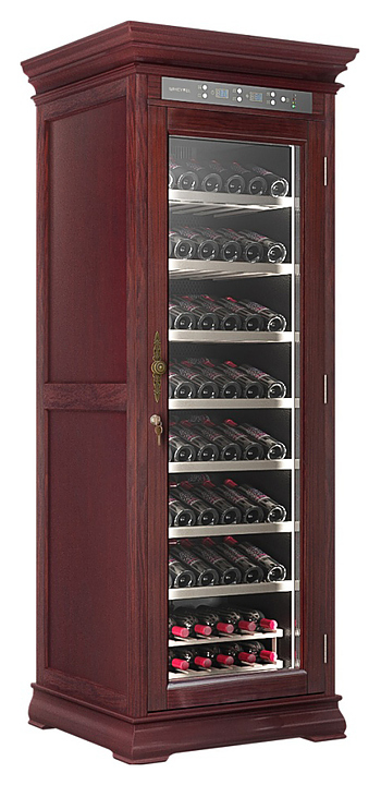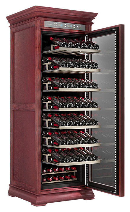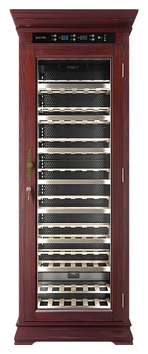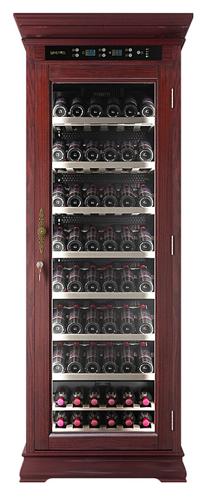 Винный шкаф MEYVEL MV108-WM1-C предназначен для демонстрации, хранения и создания оптимальных условий для сохранения всех вкусовых свойств вина в бутылках на предприятиях общественного питания, торговли, в барах, ресторанах, специализированных магазинах, частных домах или квартирах. Модель оснащена сенсорной панелью управления, электронным термостатом и светодиодной подсветкой. Корпус выполнен из обшитой красным американским дубом стали, дверь - из деревянной рамы и двойного стекла с защитой от ультрафиолетовых лучей, полки - из массива бука, ручка двери - из стали.
