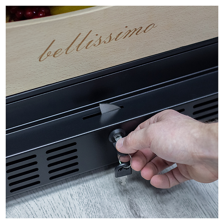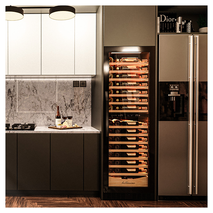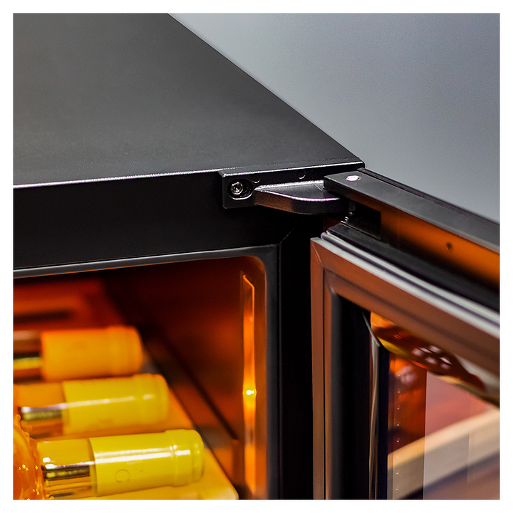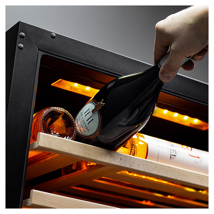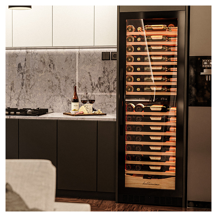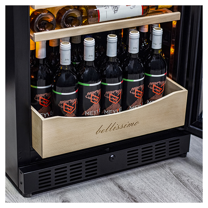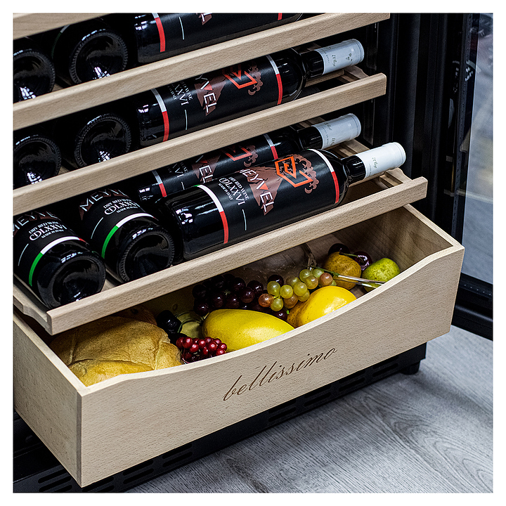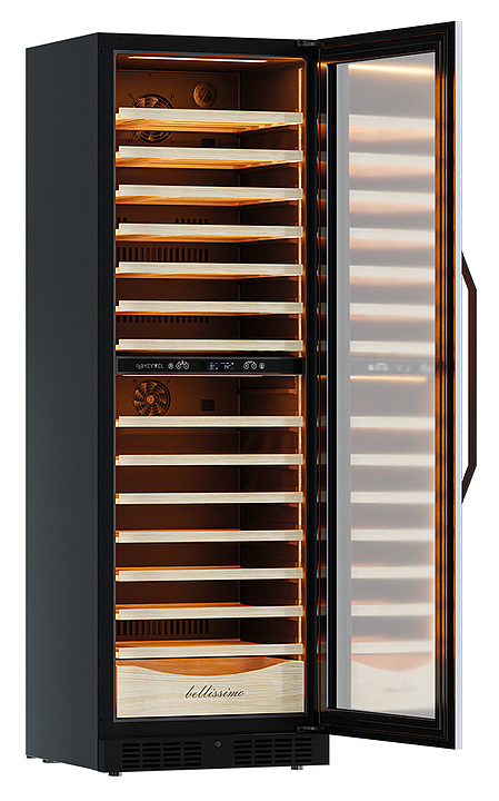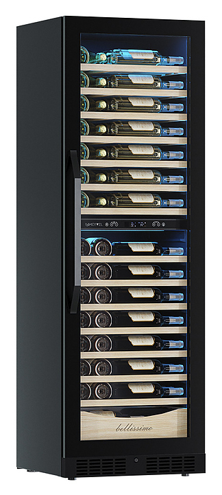 Винный шкаф MEYVEL MV110-KBT2 предназначен для демонстрации, хранения и создания оптимальных условий для сохранения всех вкусовых свойств вина в бутылках на предприятиях общественного питания, торговли, в барах, ресторанах, специализированных магазинах, частных домах или квартирах. Модель оснащена сенсорной панелью управления, 2 электронными термостатами и внутренней светодиодной подсветкой. Корпус и дверная ручка выполнены из окрашенной в черный цвет стали, дверь - из тройного стекла с УФ защитой с черной рамкой, полки - из массива бука.